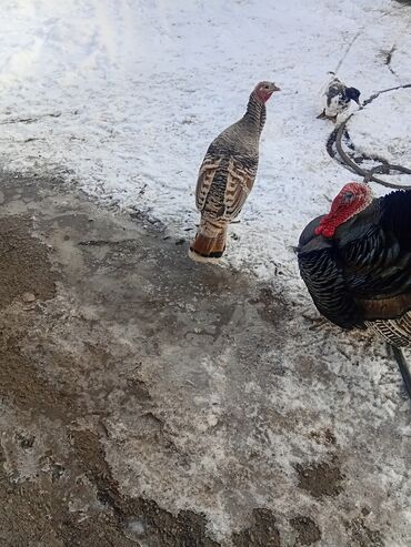 Индюки (самец и самка), порода с широкими бронзовыми/бурыми полосами на хвосте и крыльях.