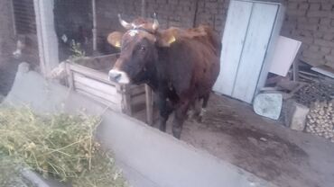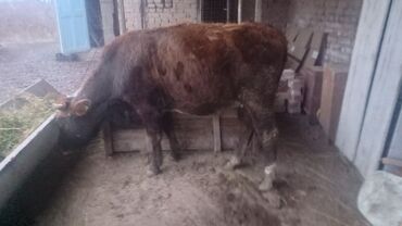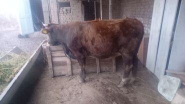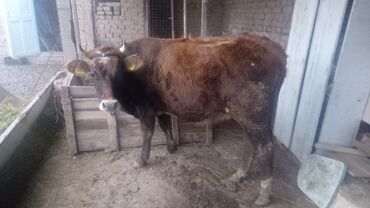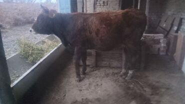 Коровa (молодая, рогатая), масть рыжевато-бурая с белыми отметинами на лбу и морде. На ушах — бирки идентификации. Животное крепкой конституции, ровный корпус, хорошо выраженная линия спины и грудь. Рога аккуратно сформированы. На фото — содержание в хлеву, кормление сеном/зелёной массой из кормушки.