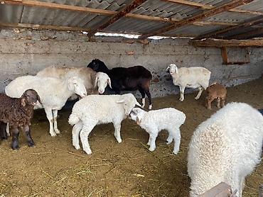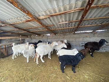 Овцы с ягнятами, разного окраса (белые, черные, бурые) и возраста. На фото — маточное поголовье и молодняк, содержатся в крытом загоне. Породы мясо-шерстного направления, длинношерстные, с висячими ушами; среди ягнят встречаются как одноцветные, так и пестрые особи. Подходят для разведения, увеличения стада и получения мяса/шерсти. Животные спокойные, пасуются группой, приучены к стойловому содержанию. Возможна передача сразу группой: матки с подсосными ягнятами и отдельно подросший молодняк.