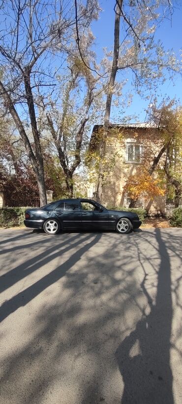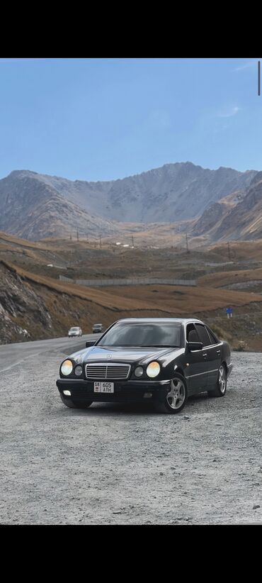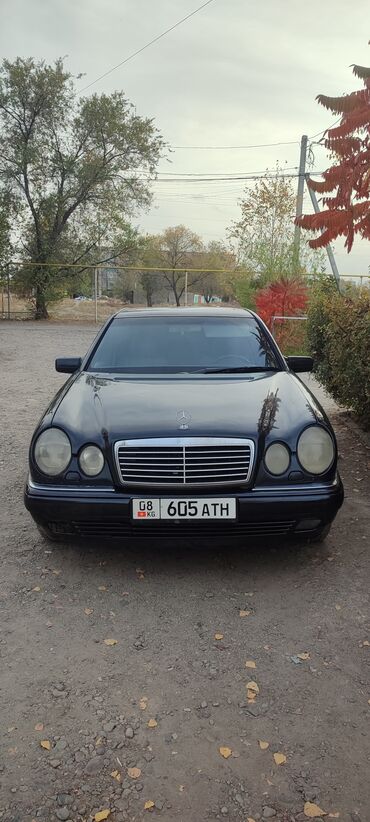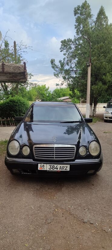 Mercedes‑Benz E‑Class (W210), седан, черный цвет кузова. Классический дизайн с фирменной решеткой радиатора и двойной оптикой, оригинальная звездочка на капоте. Передние противотуманные фары, линзованные блок‑фары, габаритные огни. Тонированные стекла.