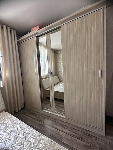 - Шкаф-купе с тремя раздвижными дверями, центральные двери с зеркалами в полный рост; удобные вертикальные ручки. Подходит для компактных спален, визуально расширяет пространство.