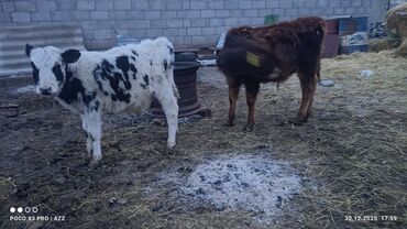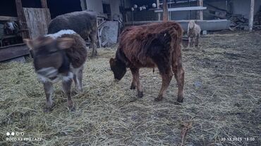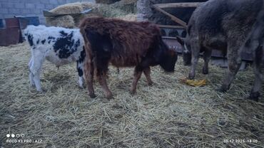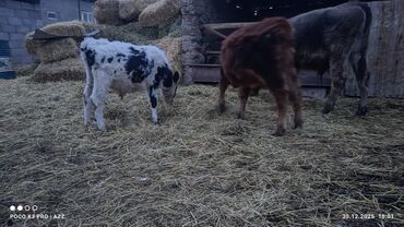Телята на откорм - Молодняк крупного рогатого скота, биркованный. - На фото — несколько телят мясного направления, различные масти (рыжая, чёрно-белая и др.). - Содержатся в тёплом помещении, на п...