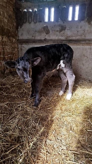 - Порода/тип: помесный мясо‑молочный теленок темного окраса с белыми отметинами на ногах и крупе.