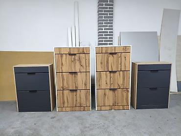 - Модель: модульные обувницы со столешницей под дерево (дуб) и фасадами двух типов: под дерево и графит матовый. Корпус — белый либо под дерево (варианты на фото).