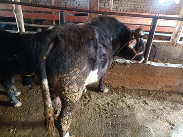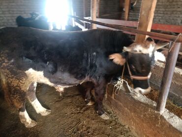 Бык-производитель, чёрно-пёстрый окрас. Крупный, сильный, с широкой грудью и хорошо развитыми мышцами. Содержится в крытом загоне, на привязи, с кормушкой для сена. На фото — реальное животное, спо...