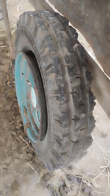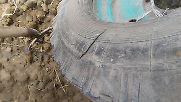 - Колесо в сборе: стальное дисковое колесо с шиной крупного профиля повышенной проходимости. Посадочный диаметр ориентировочно 16–18", протектор с выраженными грунтозацепами, камера. На боковине шины виден продольный разрез; диск окрашен в бирюзовый цвет, штатные крепёжные отверстия.