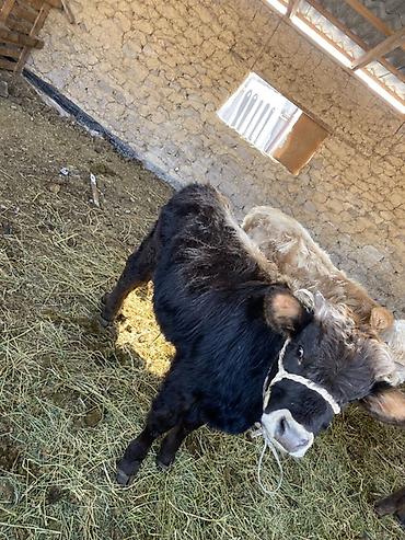 - Возраст визуально — молодые телята; содержатся в отдельном стойле на подстилке из сена.