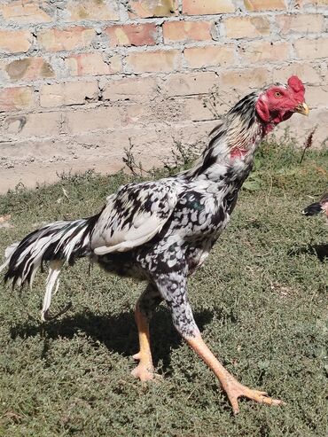 Петухи бойцовой породы (похоже на тип ашиль/азиль). Описание: - Высокие, вытянутые, крепкое телосложение, сильные ноги. - Оперение пестрое серо-черное, красные гребни и сережки. - Длинная шея с р...
