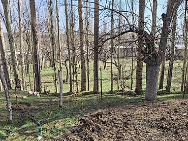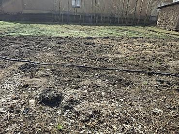 - Просторный огород с междурядьями для посадок, молодые кустарники и деревья; проложен поливочный шланг/капельная линия.