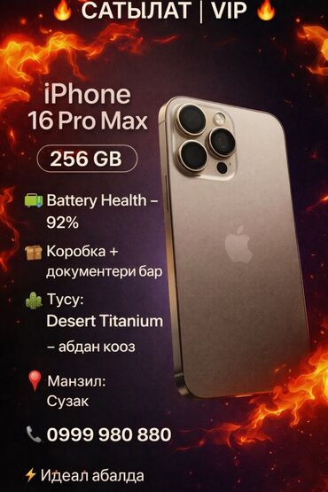 IPhone 16 Pro Max— цвет Dessert Titanium) С коробкой и всем комплектующим Батарея 94% Память 512 гб Состояние идеальное Идеален для фото/видео, игр и повседневных задач. Цвет изысканный, нейтраль...