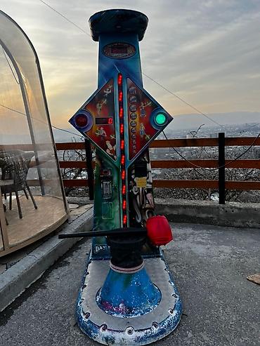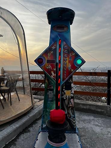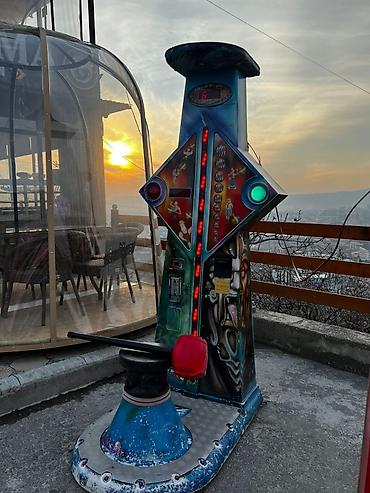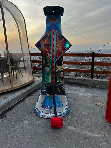 Аркадная игра на проверку силы, выполненная в ярких цветах с изображением персонажей. Имеет высокий вертикальный столб с индикатором силы и мишенью вверху. В комплект входит молот с красным бойком для удара по платформе. Игра предназначена для развлекательных центров, парков аттракционов или других публичных мест, где посетители могут испытать свою силу. Яркий дизайн привлекает внимание и создает праздничную атмосферу.