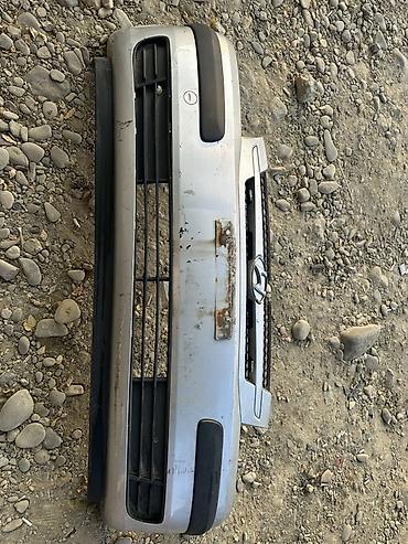 - Передний бампер с центральной решёткой радиатора и декоративными накладками по бокам. Цвет серебристый, штатные посадочные места под крепления и номер.
