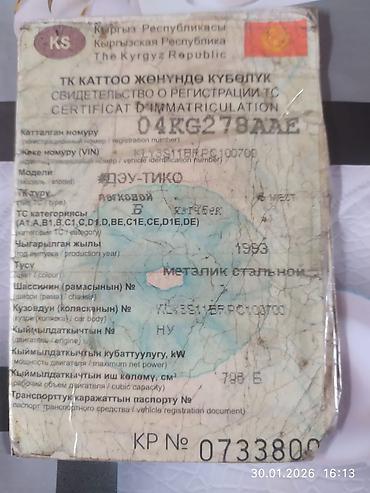 Daewoo Tico, 1993 г.в., легковой автомобиль. Цвет — металлик (стальной). Тип кузова — HV (хэтчбек). Рабочий объём двигателя — 798 см³. Максимальная мощность — 34 кВт. Категория ТС: A1, A, B1, B, C1, C, D1, D, BE, C1E, CE, D1E, DE. VIN: KLEE3G11EPRC100700. Номер кузова: KLEE3G11EPRC100700.