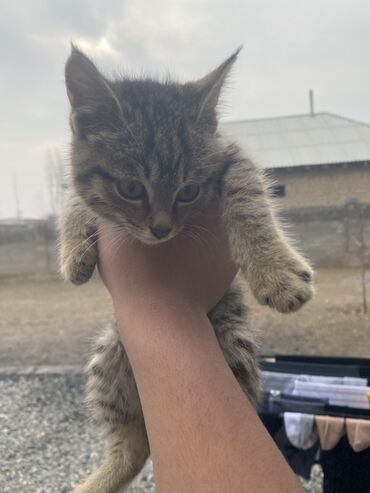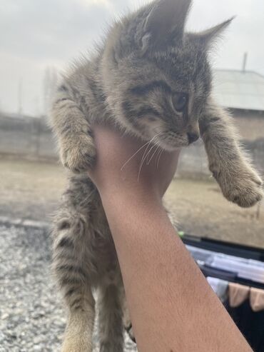 Котёнок, классический тигровый окрас (серо-коричневый табби) с яркими полосками и белыми «подушечками» на усах. Крупные ушки, выразительные янтарные глаза, пушистый хвост. Возраст визуально небольшой (примерно 2–3 месяца). Активный и любопытный, хорошо идёт на руки. Подходит для домашнего содержания: игривый компаньон, быстро привыкает к людям.