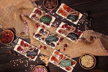 Упаковка всех позиций — стеклянные банки/бутылки с крафтовыми крышками и шнуром, фирменные ярлыки с составом и рекомендациями по использованию. Подходит для домашнего стола и в качестве атмосферного гастрономического подарка в «таёжном» стиле.