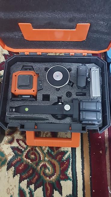 - Лазерный нивелир в оранжевом кейсе: компактный корпус нивелира, магнитная/вакуумная круглая площадка-основание, поворотный штативный кронштейн с пузырьковым уровнем, два аккумулятора, зарядное устройство и аксессуары в формованных ячейках.
