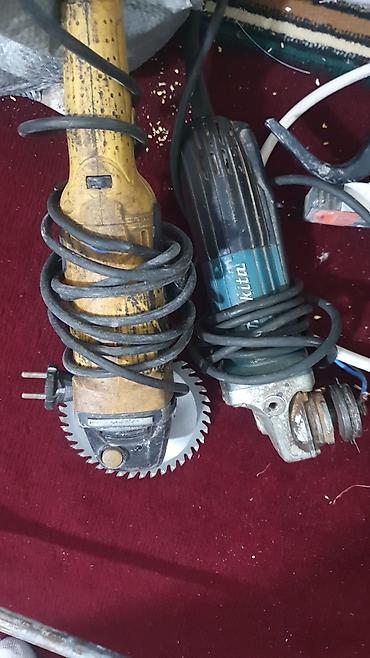 - УШМ (болгарки): одна синяя Makita и одна желтая, обе сетевые; на одной установлен пильный диск по дереву/ламинату.