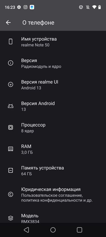 Подходит для повседневных задач, мессенджеров, соцсетей и фото. Скриншоты “О телефоне” прилагаются: Android 13, 8 ядер, 3/64 ГБ, модель RMX3834.