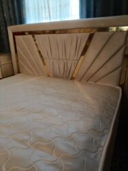 - Двуспальная кровать с мягким высоким изголовьем. Изголовье декорировано вертикальными и лучевыми вставками, обрамление с глянцевыми золотистыми планками. Основание кровати в том же тоне.