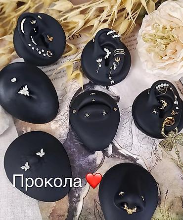 - Украшения: медицинская сталь и титан, насадки с кристаллами, мини-гвоздики, кольца, сегментные клики, каффы; варианты в золоте и серебре по цвету. Миниатюрные звёзды, бабочки, дорожки, цепочки, лаконичные шарики.