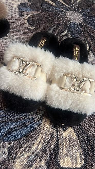 3) Пушистые шлёпки с белым мехом и декоративной пряжкой с инициалами