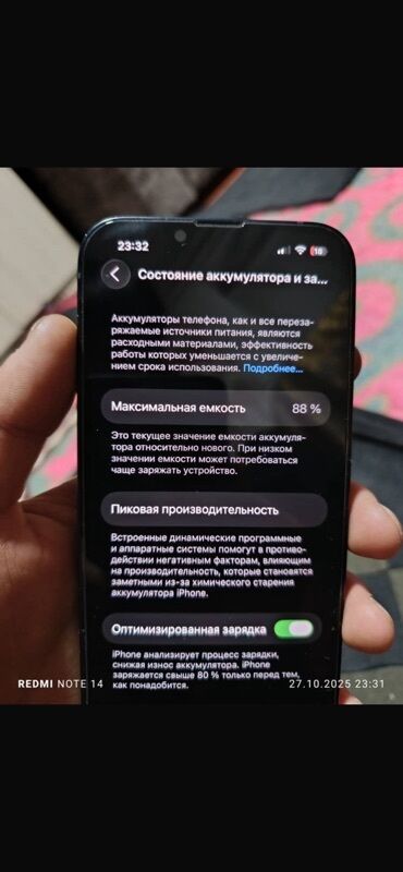 - Аккумулятор: максимальная ёмкость 88%, включена «Оптимизированная зарядка».