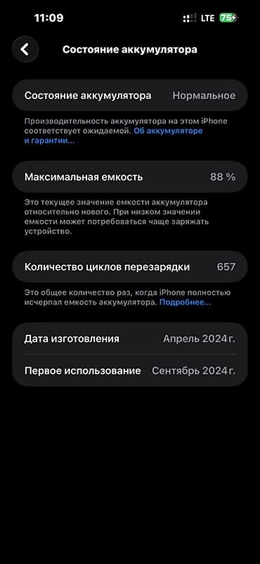 - Аккумулятор: состояние — «Нормальное», максимальная емкость 88%, 657 циклов перезарядки (по скриншоту)