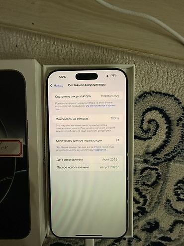 - Аккумулятор: максимальная ёмкость 100%, 24 цикла перезарядки (по разделу «Состояние аккумулятора»)