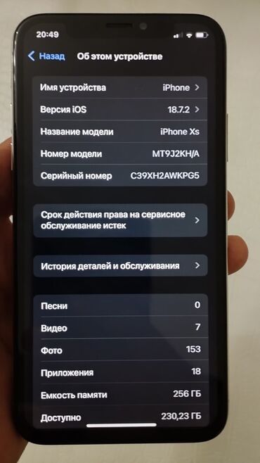 IPhone XS, 256 ГБ, цвет Gold Характеристики и особенности: - Модель: iPhone XS (экран , OLED Super Retina, Face ID) - Память: 256 ГБ (доступно ~232,66 ГБ на момент фото) - Версия iOS: 18.7.3 - Ном...