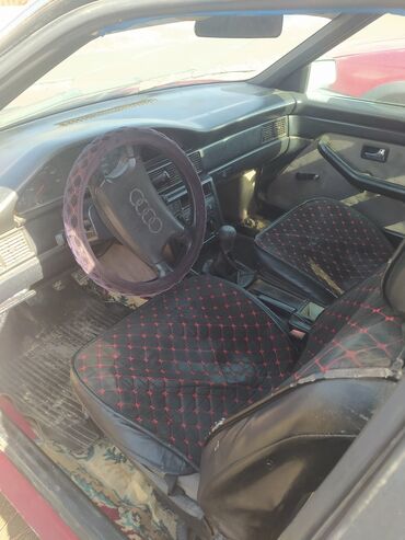 Audi 100 C3 (седан), красный. Основные характеристики: - Кузов: 4-дверный седан, классический дизайн серии C3. - Салон: тканевые чехлы на передних сиденьях, дополнительные подушки-подголовники, пе...