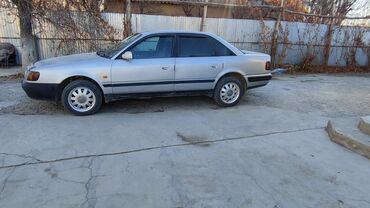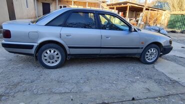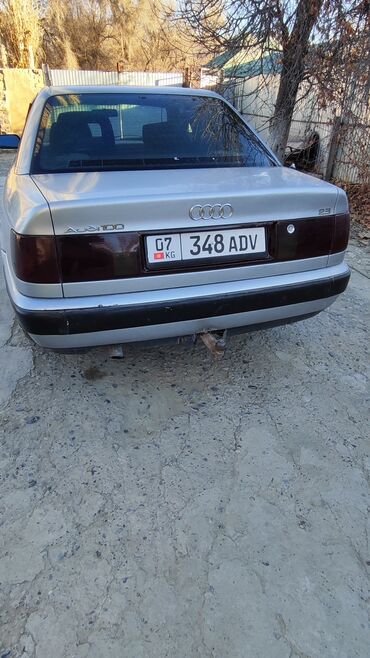 Audi 100 C4 седан, серебристый цвет, левый руль. Бензиновый мотор 2.3 (эмблема “2.3” на крышке багажника), передний привод. Кузов 4-дверный, тонированные задние стекла.