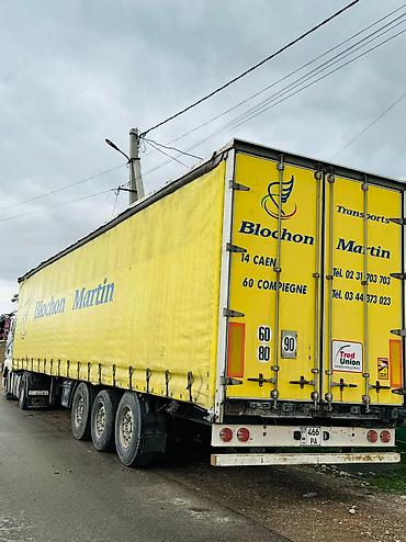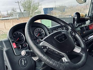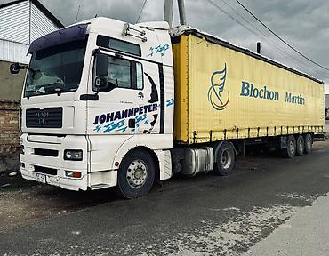 Грузовой автомобиль MAN (кабина оранжевая), тентованный бортовой. Основные особенности: - Колесная формула 4x2, задняя тележка односкатная. - Дизельный двигатель (марка MAN), передний привод на ру...