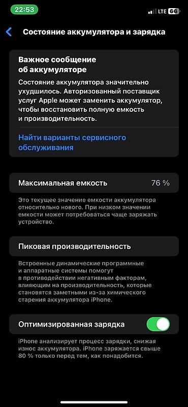 - Аккумулятор: максимальная емкость 76% (в разделе «Состояние аккумулятора» отображается уведомление о необходимости сервисной замены для восстановления полной емкости и производительности).
