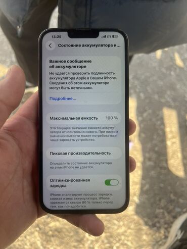 - Аккумулятор: максимальная ёмкость 100%; в разделе «Состояние аккумулятора» отображается сообщение о невозможности проверки подлинности аккумулятора Apple