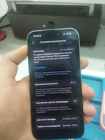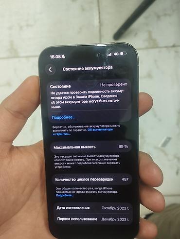 - Состояние аккумулятора в системе: максимальная емкость 89%, количество циклов перезарядки 457; проверка подлинности батареи не выполнена (сообщение в iOS).