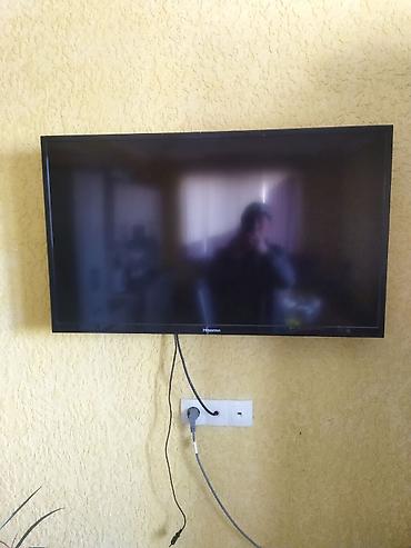 Телевизор Hisense, диагональ ориентировочно 40–43". Плоская LED-панель, тонкие рамки, настенное крепление (кронштейн) уже установлен. На корпусе логотип Hisense по центру нижней рамки. Подключение по сети питания, видны кабели для внешних источников (в т.ч. HDMI). Отлично подходит для гостиной или спальни: компактный, с современным дизайном, хорошо смотрится на стене. Поддерживает подключение приставок, медиаплееров и других устройств через доступные разъёмы.