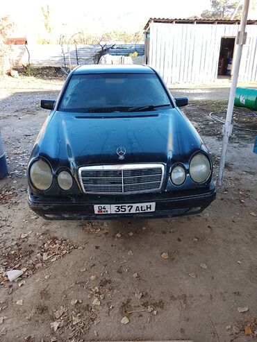 Mercedes-Benz E-класс (W210), седан, черный цвет. На фото — автомобиль на транзитных номерах. Указано: окончательно 210 мин. сом; “Асты чирик номер транзит. ОБМЕН НЕ ИНТЕРЕСУЕТ.”