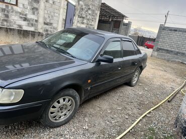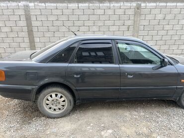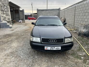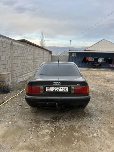 Audi 100 C4 седан, темно‑серый цвет, двигатель 2.0 (эмблема 2.0 на крышке багажника). Кузов классической формы, тонировка стекол по кругу, стальные диски с фирменными колпаками Audi. Оптика прямоугольная, зеркала и молдинги в цвет кузова. Антенный штырь на крыше, фаркоп сзади. Номер региона KG на белых номерах “257 ADS”.