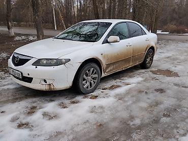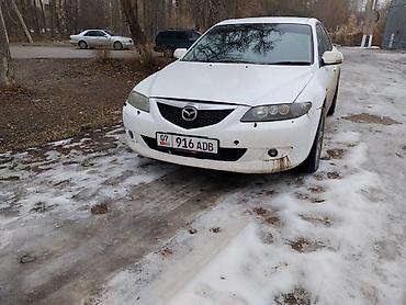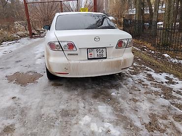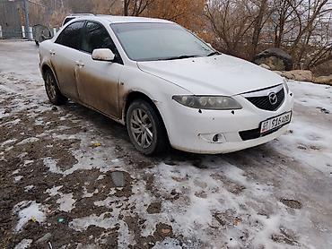 Mazda 6, седан, белый цвет. Киргизские номера (KG), номерной знак виден на фото. Кузов 4-дверный, классический дизайн первого поколения Mazda 6 с фирменной решеткой радиатора и узкими фарами.