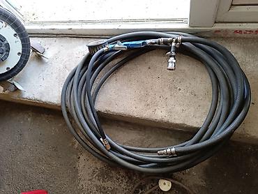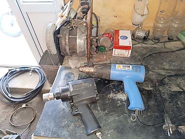 - Комплект аксессуаров и расходников, видимых на фото: крестовой ключ, пневмошланги, насадки и мелкий инструмент.