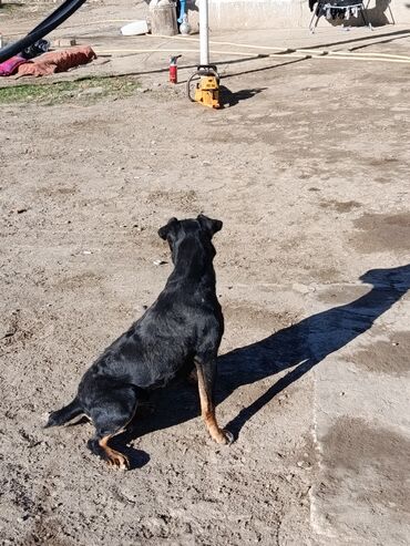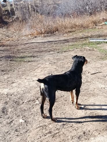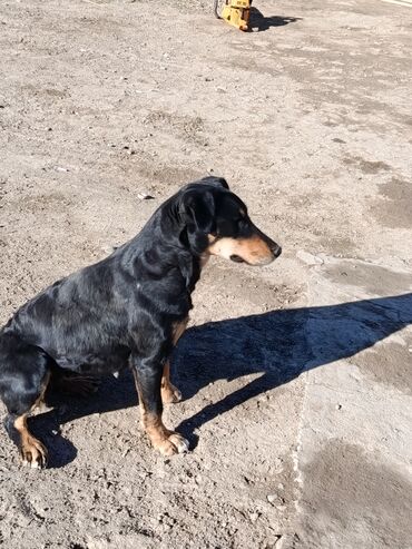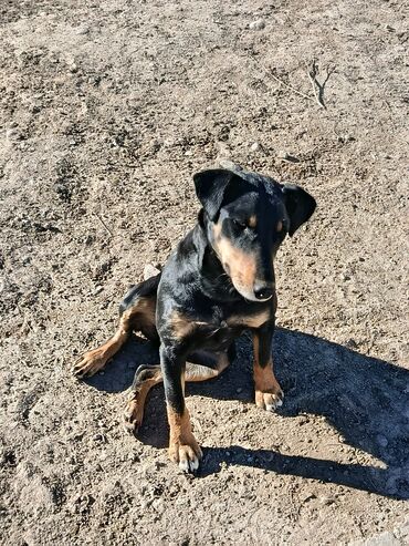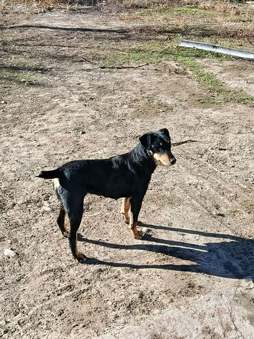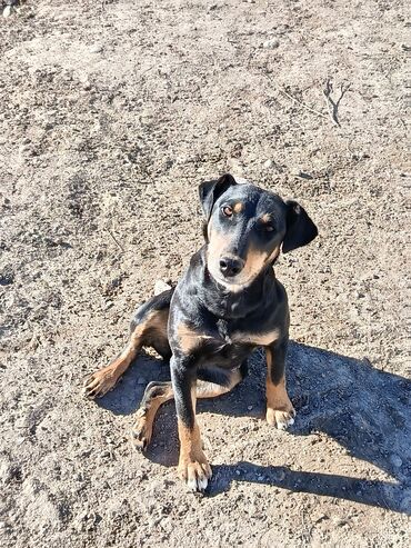 Собака среднего размера, гладкошёрстная. Окрас чёрный с рыжими подпалинами на морде, груди, лапах и под хвостом. Уши полуприжаты, хвост прямой. Телосложение сухое, мускулистое; грудь глубокая, лапы крепкие. Шерсть короткая, блестящая, легко ухаживать — достаточно регулярного вычёсывания. На фото видно спокойный, контактный характер: сидит по команде, внимательно держит взгляд, не проявляет агрессии. Хорошо подходит для загородного содержания и активных прогулок. Возможен как компаньон и сторож для двора/участка.