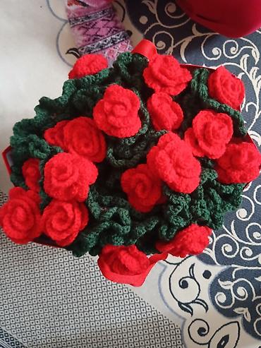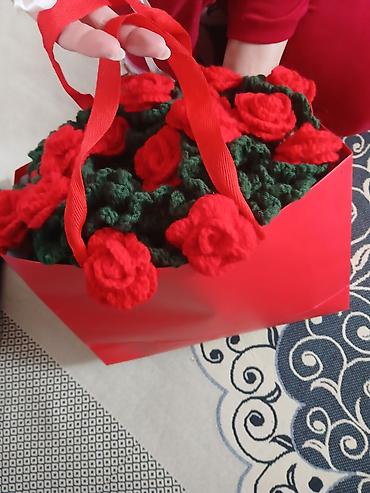 - Объемный букет из ярко‑красных вязаных роз с зелёной листвой.