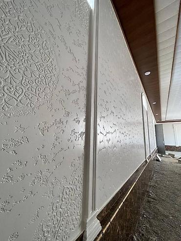 - Декоративная штукатурка фасада с выразительной фактурой (эффект “короед/шуба”), ровная геометрия, аккуратные примыкания.