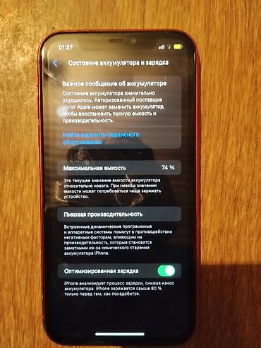 - Аккумулятор: максимальная емкость 74%; в настройках отображается сообщение о необходимости сервисной замены аккумулятора; включена оптимизированная зарядка