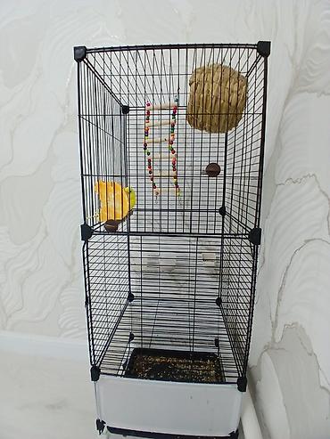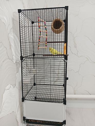 Продаю или меняю. Волнистые попугаи с клеткой и аксессуарами. Клетка высокая, 2этажа)). + канура. - Пара волнистых попугаев: один голубой с белой головой и черными волнам...