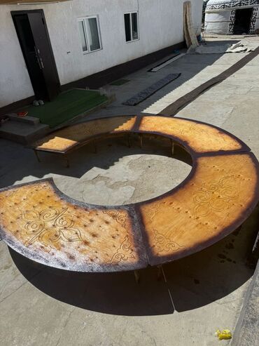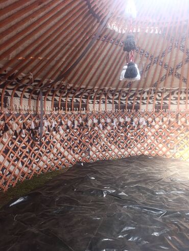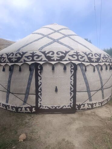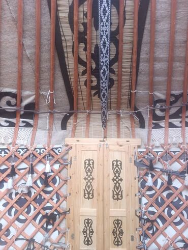 - Комплект с деревянным каркасом: кереге (решётчатые стенки), уыки (кровельные жерди), шанырак (верхнее кольцо), двери из массива с резным орнаментом.