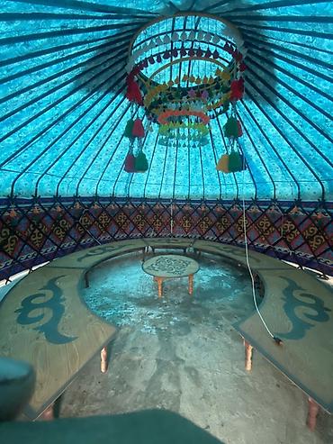 - Внутренняя отделка: цветной подбой/тент с национальным узором, подвесной декор (қошкармуйыз-орнамент, кисти).