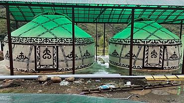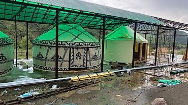 - Традиционные круглые юрты с национальным орнаментом