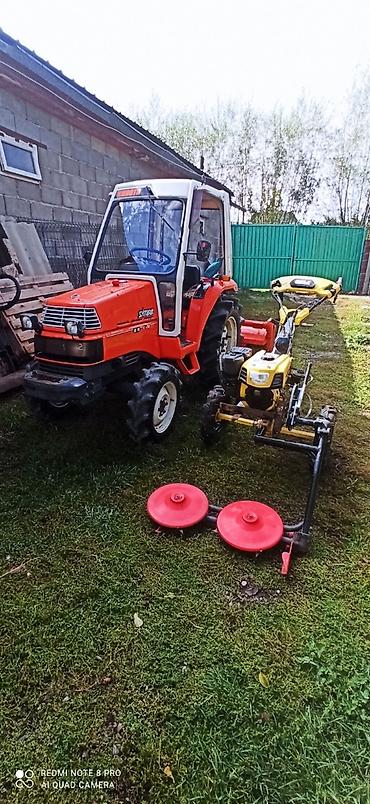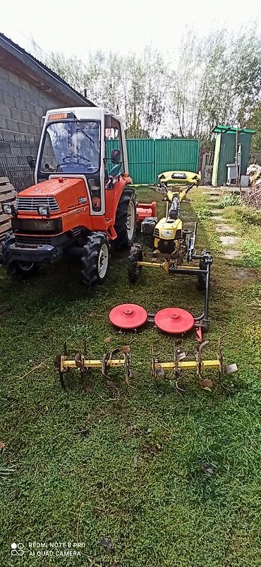 Рядом на фото — компактный трактор-минитрактор Kubota с кабиной (иллюстрация масштаба, не указан как часть комплекта на снимках). Основной предмет — мотоблок с указанными навесами.