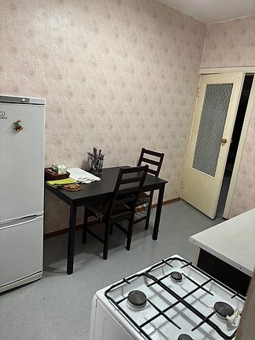 - Кухня с обеденным столом и двумя стульями, газовой плитой, холодильником Indesit, рабочей столешницей и мойкой; посуда и кухонные принадлежности на фото.